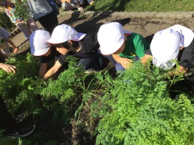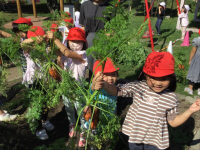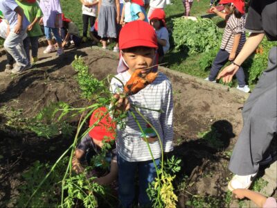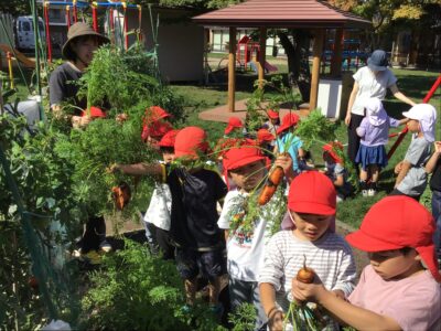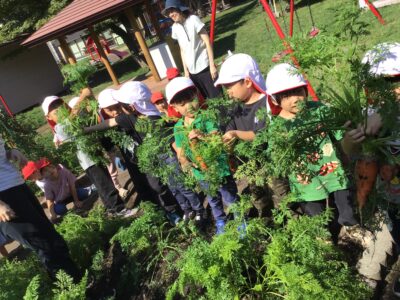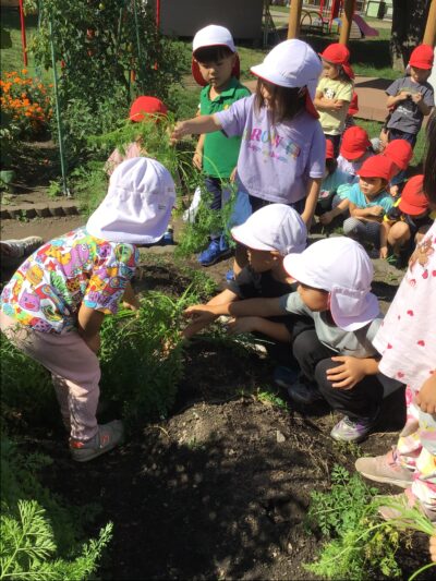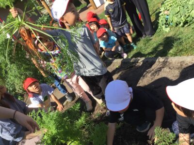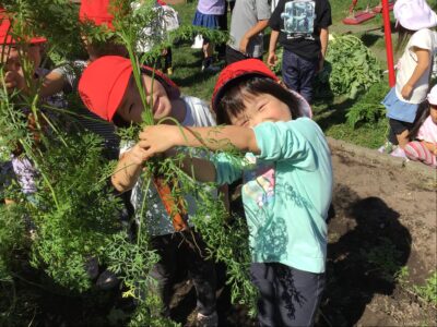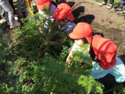 秋晴れのいいお天気の中、年中クラスで春に植えた人参を収穫しました。