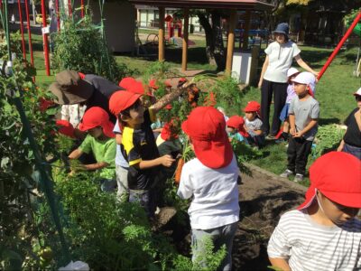 お友だちと力を合わせて収穫します。