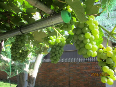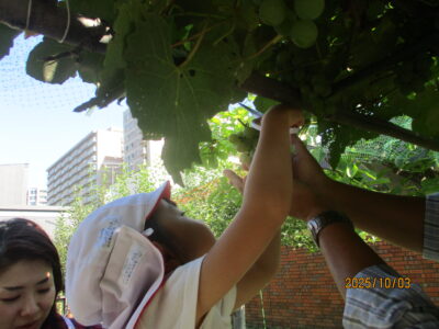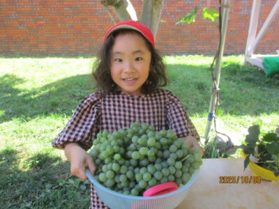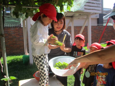 こどもの家ではぶどうの木が食べごろを迎え、年長クラスは3日、年少中クラスは6日に収獲を行いました!