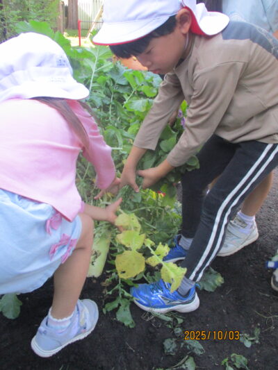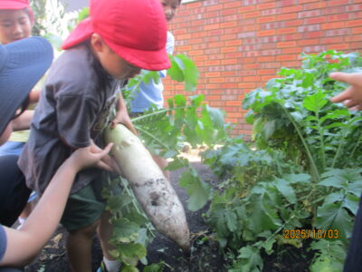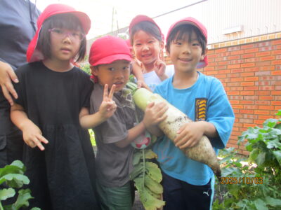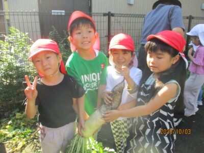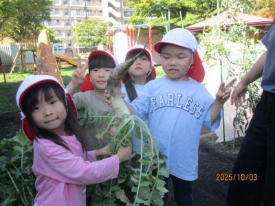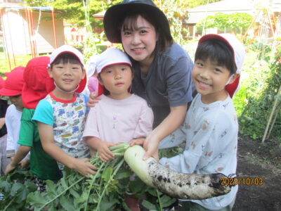 中には、腕と同じぐらい大きな大根を収穫したお友だちも!たくさんのお恵みを神様から頂くことができましたよ。