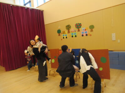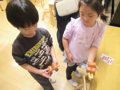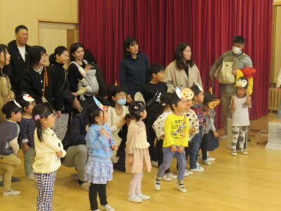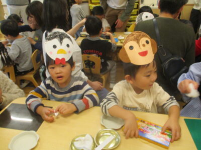年少クラスでは、サルとペンギンのお面を保護者の方と一緒に作り、それを使いかくれんぼゲームをしましたよ。