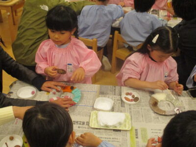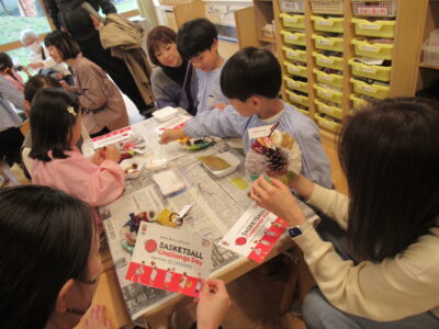 選んだものを子どもたちが毛糸を巻き付けて作ったリースに、保護者の方と一緒に飾り付けしていきます。