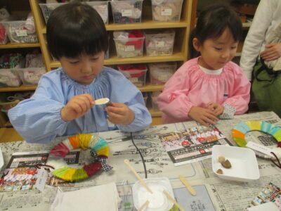 年長クラスでは、秋の自然物を使い秋のリース製作を行いました。