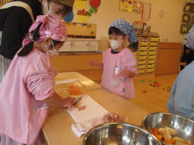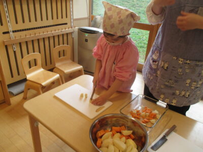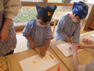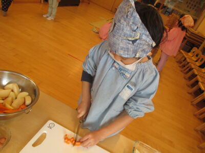 みんなで育てたにんじんも小さく丁寧に切ることができました。おうちで練習してきた子もいたようで、先生の手伝いいらずでしたよ。