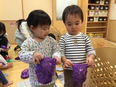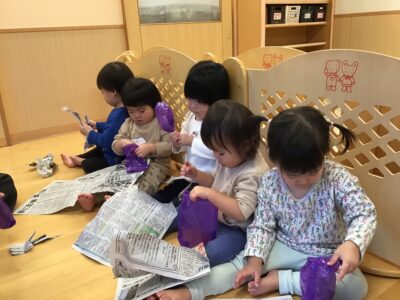 焼きいもパーティーの雰囲気を感じられるよう、うさぎ組さんは、お部屋の中で焼きいもパーティーごっこをして過ごしましたよ!