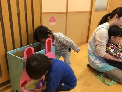 お話が上手になり、お友だちとやり取りを楽しみながら遊ぶ姿が増えたうさぎ組さん。その中で「いらっしゃいませ~」「〇〇いりますか?」等のお店屋さんごっこであったり、「どこが痛いですか?」と病院ごっこが始まったりと、ごっこ遊びを楽しむ姿が増えています。