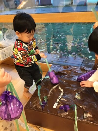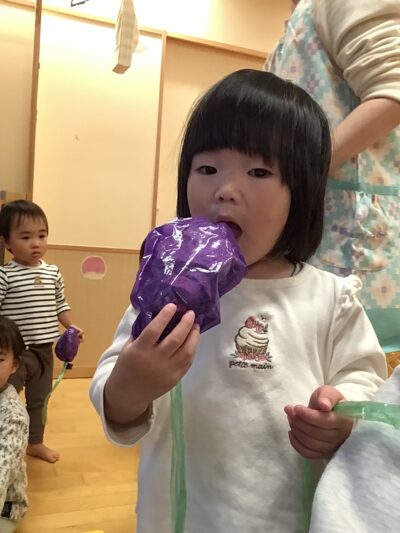 朝から焼きいも尽くしの一日で、焼きいもグーチーパーの手遊びを元気いっぱい歌ったり、焼きいもの絵本をみて「ぱくっ」とおいもを食べたり、焼きいもに親しみをもった様子でしたよ♪