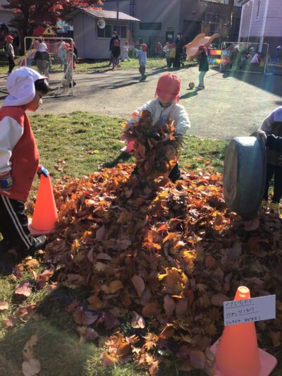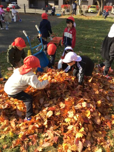 数日前から焼き芋パーティーに向け、朝の外遊びで園庭に落ちた落ち葉をたくさんかき集め、楽しみに期待を高めていた子どもたち。
