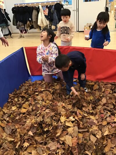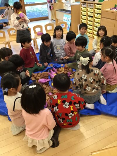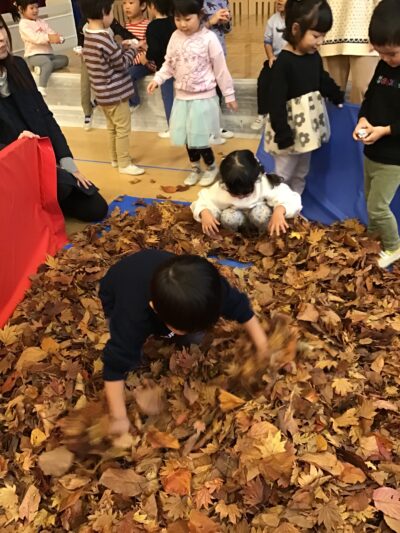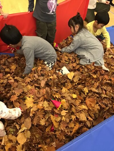 ホールでは落ち葉を広げて、その中から給食さんの作ってくださったふかし芋を探して、