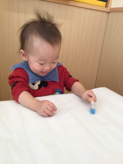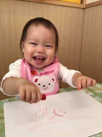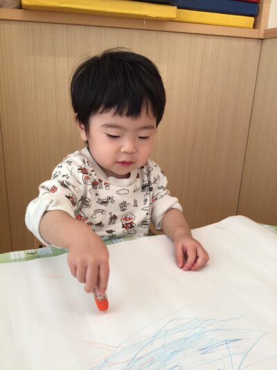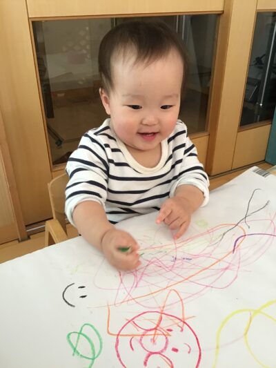 初めは、様々な色のクレヨンを前に戸惑ったり、じっと見つめたりしていましたが、手に取ってみると楽しくなってきた様子で、思いのままに点や線を描いてはにっこりとかわいい笑顔に。