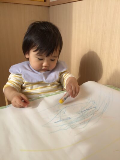 今日は、ひよこ組さんのお部屋での過ごし方をご紹介します。この日は、初めてのクレヨンを用いたお絵描きに挑戦しました。線や色の変化に気付き、思いおもいに描く経験を通じて、表現する喜びや指先の力を育みます。