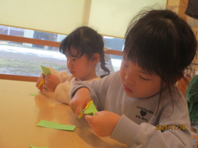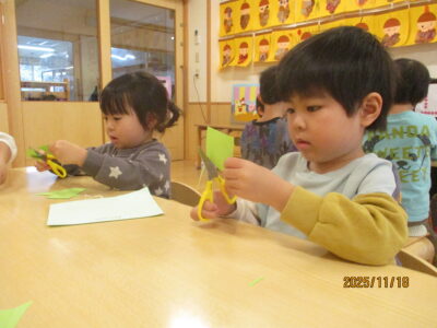 まず1日目はハサミの活動です。これまでハサミも何度も使用し、使い方もしっかり身についてきて