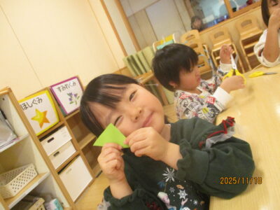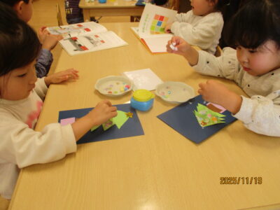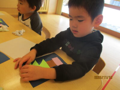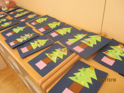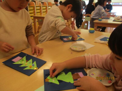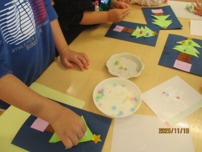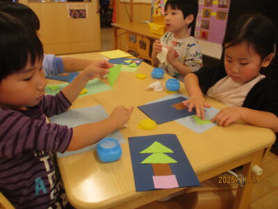 ツリーが出来上がると「先生!いっぱい貼ったよ!」「かわいい~♪」ととっても嬉しそうでした。
