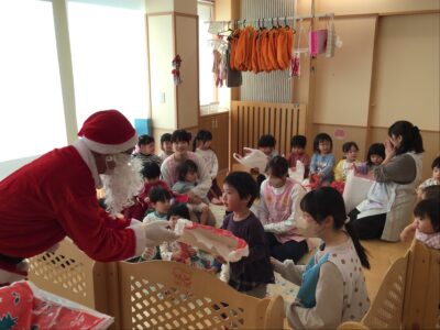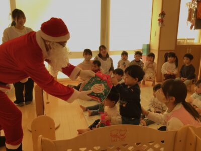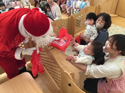 ワクワクした顔でニコラオおじさんを見つめる子や少し緊張した様子の子など様々な姿がありましたが、ニコラオおじさんが持ってきてくれた沢山のプレゼントをみると、たちまち笑顔が増えました。ひよこ組さんから順番にプレゼントを受け取り、うさぎ組さんやくま組さんは「ありがとう」とお礼も上手に伝えられました。