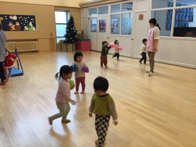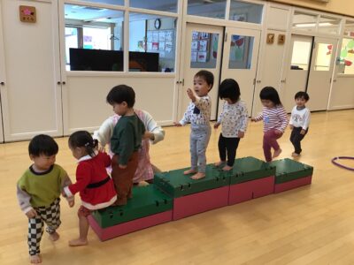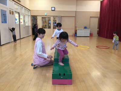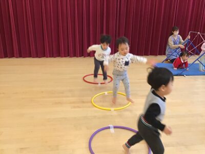今日は、そんなうさぎ組さんのホール遊びの様子をご紹介します。この日はサーキット遊びとボールをしました。身体を動かすことが大好きなうさぎ組さんは元気いっぱいに遊んでいましたよ。