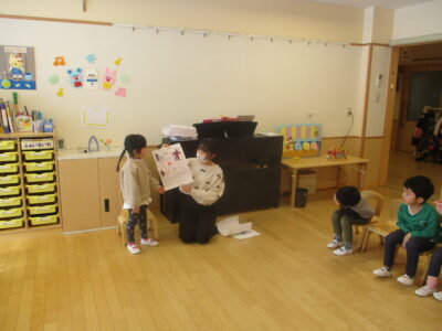 幼児クラスではホールに集まり、今年1回目のお集まりをしました。