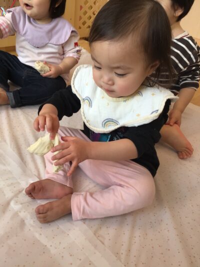 今回のブログでは、ひよこ組(0歳児クラス)の粘土遊びの様子をご紹介します。 4月の入園以来、様々な素材に触れ合ってきた子どもたちですが、小麦粉粘土は初めてです。担任の先生から差し出された謎の物体に興味津々の子どもたち、、、。最初は慎重、だんだん笑顔になりました。