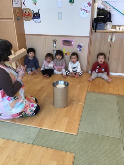翌日は、前日に遊んだ粘土を使って「もちつきごっこ」をしました。 まずは、先生によるデモンストレーション。真剣な表情が並んでいます。
