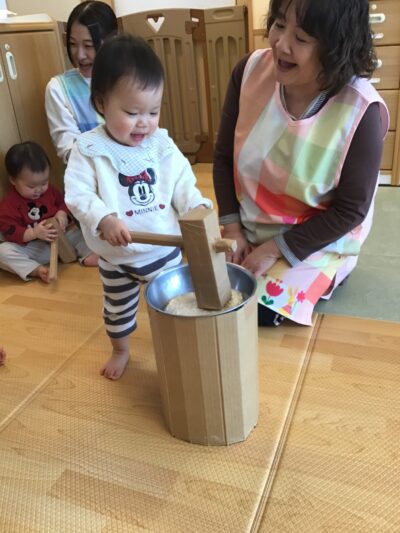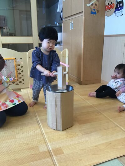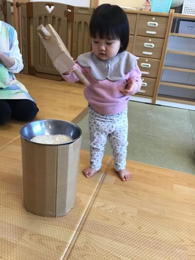 杵と臼は段ボール製です。みんな上手に持てるかな?