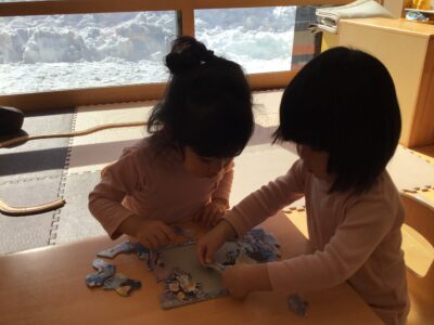 くま組さんには、うさぎ組さんよりレベルアップしたパズルがあります。大好きな絵柄でもあり挑戦!でも、難しくて…
