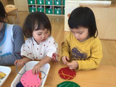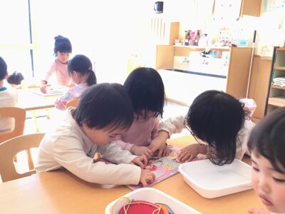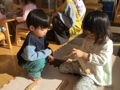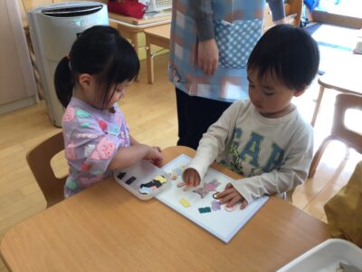どちらもくま組さんにあるおもちゃで、新鮮な気持ちで遊び始めました。「こんな風に使うんだよ」と言葉や遊ぶ姿から伝えています。