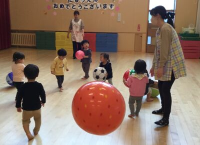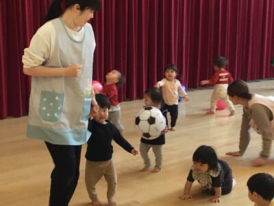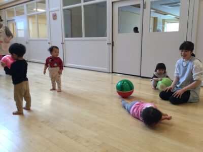 この日は、ホールでボール遊び。ゴムボールやビーチボールを投げたり転がしたり追いかけたり。