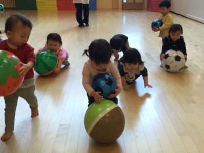 先生と一緒に走ったり、ハイハイ競争もしていました。でもお気に入りのボールは手放したくないし…忙しい子どもたち。