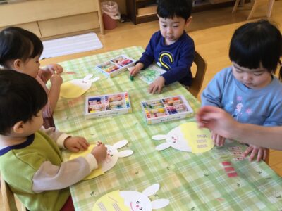 この日はイースターがモチーフの製作に挑戦。クレヨンで模様を描いたりマスキングテープで飾り付ける内容ですが、担任のお話を聞く姿から興味津々な様子が伝わってきました。