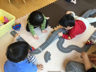 道路の組み立てに悪戦苦闘中。継ぎ目が上手にはまるかな? でも遊びたいから頑張りますし、応援しながら見守っています。以前は組み立ててもらってから遊んでいたのが、「自分でやりたいこと・できること」が増えてきて、挑戦する姿は頼もしいです。