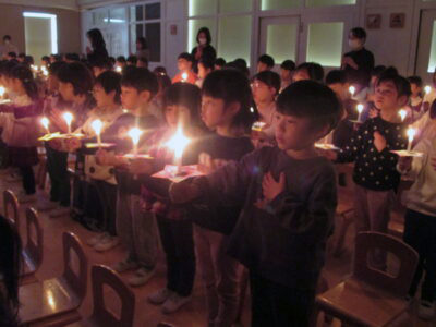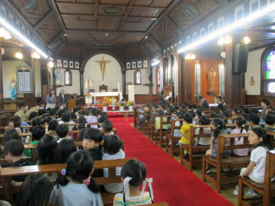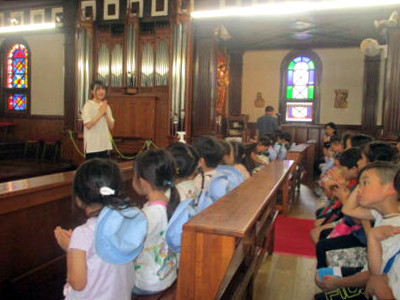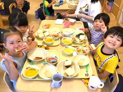 | 10:30~ | 朝の会、歌、当番活動、お祈り クラス活動/表現、音楽遊び、制作、宗教講話等 全体活動/お集まり、園外保育等 |